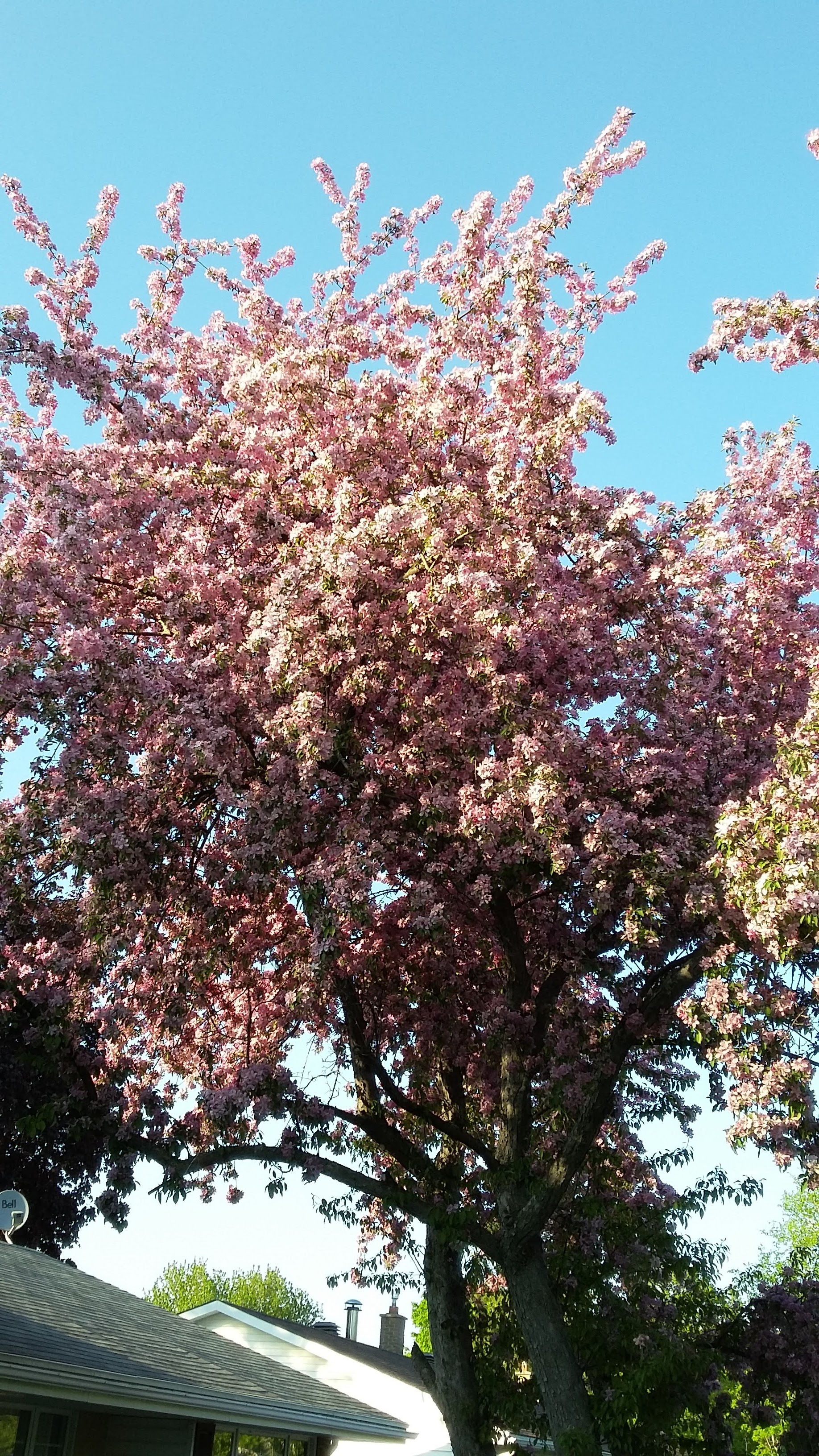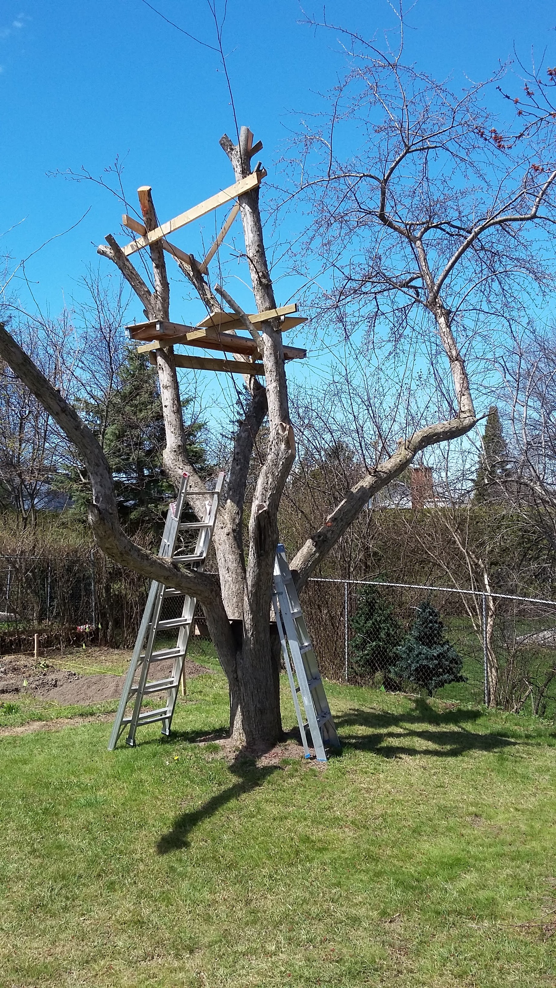 The house we moved in, last year in May, was neglected for a long time. Wonderful mature property, with lots of good size trees. We started early spring, as soon the snow melted, to redo the whole back yard. Grading, re-sodding, build a sizable vegetable garden, some flower beds and so on...Neglected, overgrown trees needed trimming. All estimates were high for our budget, so I decided to trim them myself. There are two crab-apple trees on the property. One on the front yard and one on the back. Amazing when in bloom, but disaster in the fall. They are so rich in fruit production that we could open a winery. Smell of fermentation in the air, the squished apples on cars and shoes...and inside the hose...became unbearable. The one in the backyard was due for a haircut this time, and the front will happen next year. - 'So... I'm going to trim the tree today!'-I said to my beloved. - 'No!...you won't...don't you dare do that!' - following me- 'Too big to handle it yourself'. - 'O yeah?... just watch me! - I've done bigger trees than this!' - 'When was that?...like when you were...twenty-five?' - 'Yes...but this time I'm going to do it with finesse...! I always have a plan before I start anything. This time wasn't any different. I have some scrap lumber around the house, and I'm going to build a platform between the branches, just below the cut line for good footing. I even thought of a railing system around the branches for added safety. Just finished building the platform when I heard a voice from below. - 'Howdy neighbor!...Are you building a tree house for your grand kids?' I looked in the direction of the voice, and I noticed my back yard neighbor sitting in his hot-tub, sipping a glass of wine and watching me in the branches with curiosity. - 'Oh...Hi there George!...nah...I'm building a platform'. - 'What for?' - 'To trim the tree...of course'. - 'Why not do it with a pruner?' - 'Just because...this is a major pruning!' - 'Well...good luck!' - 'Thanks' -and I continued my work with confidence. It took me a couple of days to remove most of the smaller branches, chop them up to suitable size, tie and place them in the curb. It came time for the larger branches. I wasn't able to start the chain saw I borrowed from my son, so I resulted to cut them, section by section, with a good pruning saw. I don't have to tell you how much of a workout that was. My muscles were bulging in no time! This is how it looked after my initial effort:
